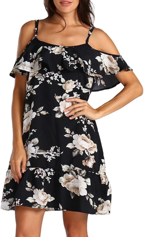 Mr Macy Vestido Floral Vestido De Verano Con Volantes Florales Y Hombros Descubiertos Vestido De Fiesta Para La Playa Negro Small Amazon Es Ropa Y Accesorios