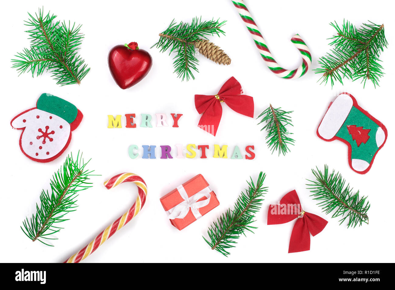 Sfondo di natale con buon natale iscrizione decorate con rami di abete  isolato su sfondo bianco. Lay piatto Foto stock - Alamy